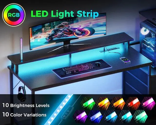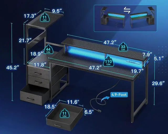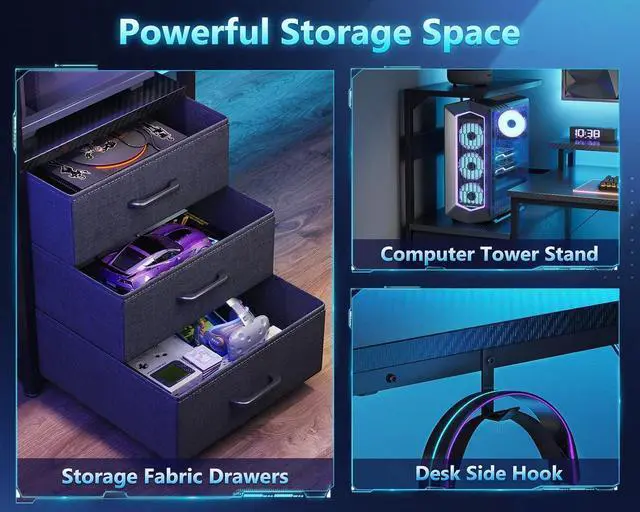 Maximize Storage with 3 Drawers & Reversible Shelf. Stay organized with the Casaottima gaming desk, designed with 3 fabric drawers, a side hook, and a spacious open shelf. The 3 drawers provide ample space for your gaming accessories, while the reversible shelf can be installed on either the left or right side to suit your setup. Store your gaming PC, headphones, or Bluetooth speakers neatly and keep everything within reach. This desk is a game-changer for keeping your space clutter-free and functional.