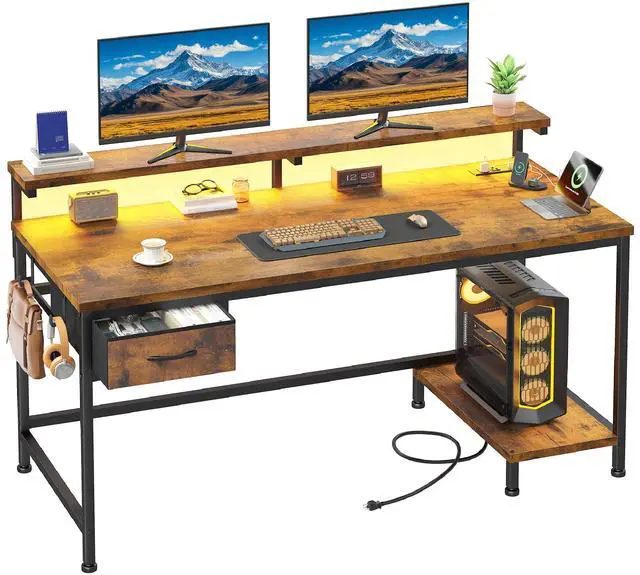 39.3Inch Office Desk with Power Outlet & Drawer, Gaming Desk with CPU Stand& LED Lights,Computer Desk with Ergonomic Monitor Stand for Small Space,Rustic Brown