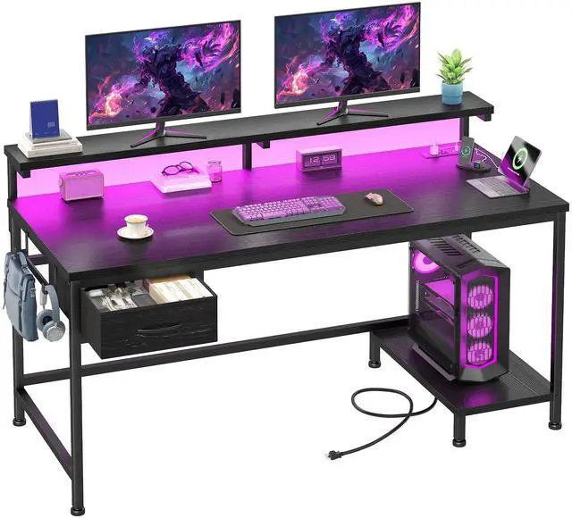 39.3" Gaming Desk with Power Outlet and LED Lights,Computer Desk with Adjutable Monitor Stand and Drawer,Office Desk with CPU Stand for Home Work,Study and Gaming, Small Spaces,Black