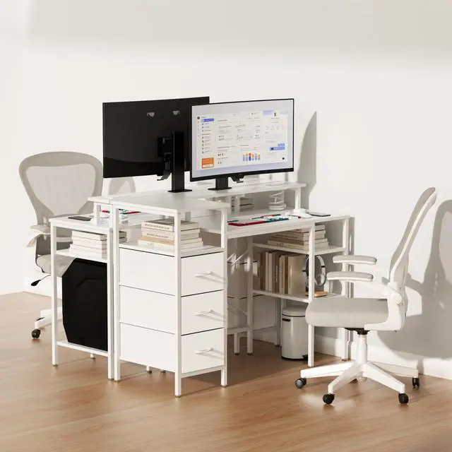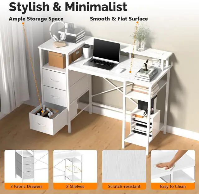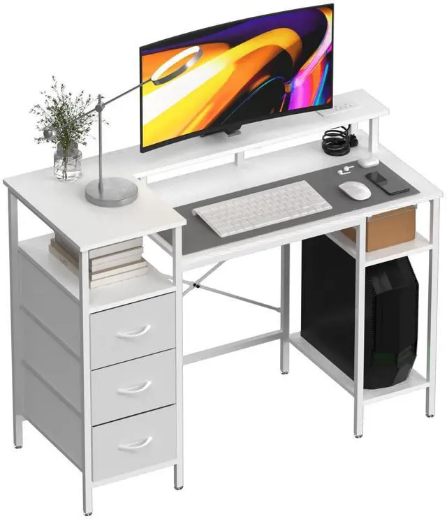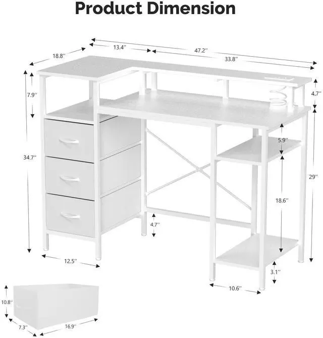 VINGLI 47 Inch L-Shaped Computer Desk, Small Computer Gaming Desk with Fabric Drawers & Storage Shelves, Charging Station, Monitor Stand for Home, Office, White