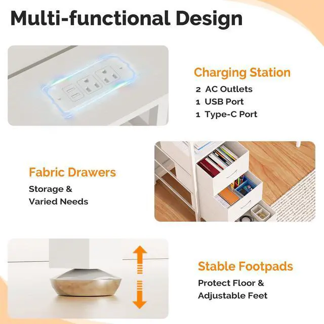 BUILT-IN CHARGING STATION- Effortlessly power your devices. The integrated charging station and strategic cable management holes keep your phone, tablet, and headset charged and organized, eliminating cord clutter for a clean and functional workspace.