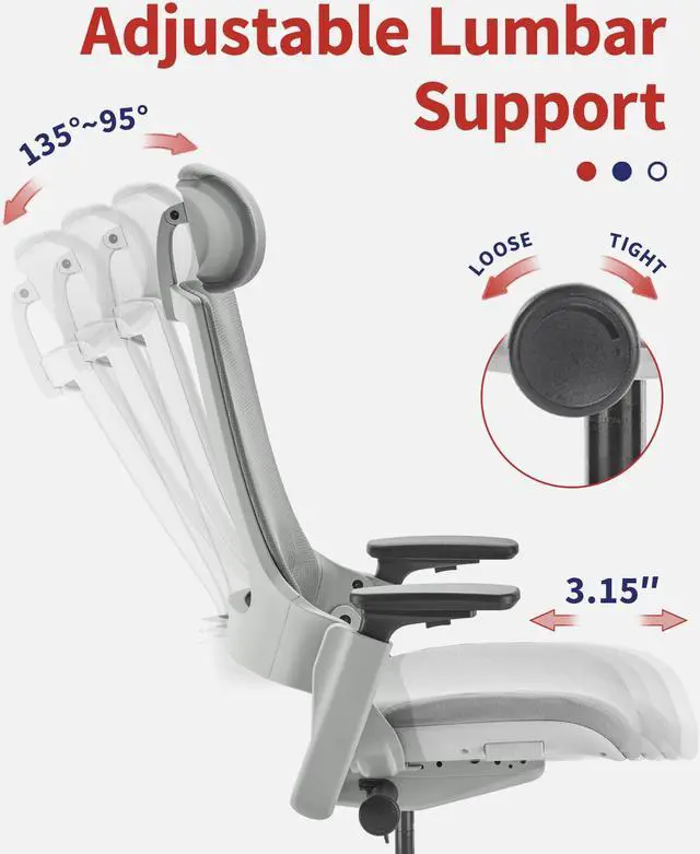 Fully Adjustable Office Chair: This 3D ergonomic computer chair offers customizable adjustments for seat height, depth, armrests, lumbar support, backrest tilt angles, and tension, ensuring a comfortable sitting position.