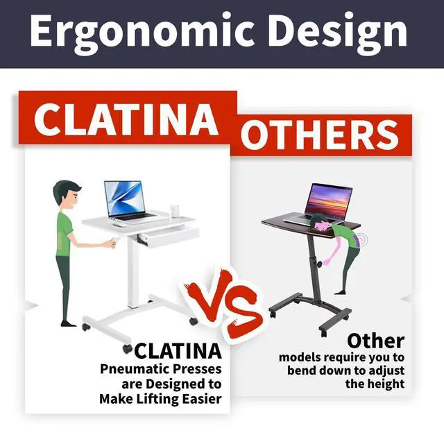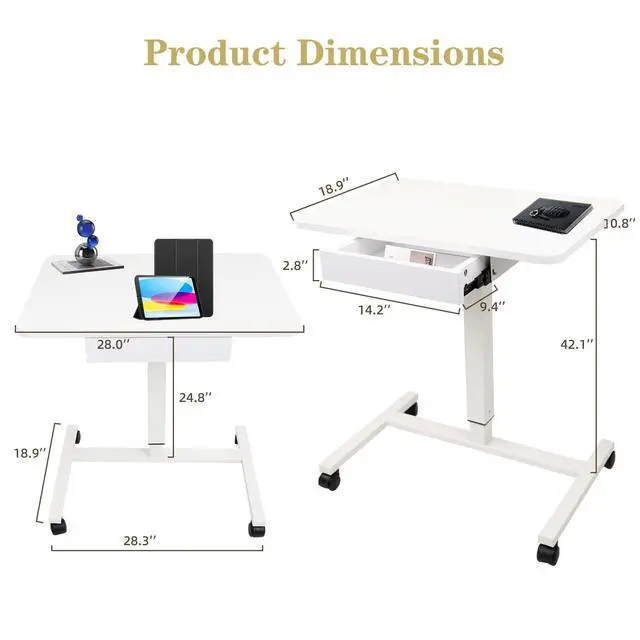 CLATINA Mobile Laptop Desk with Drawer and Lockable Wheels What makes CLATINA mobile laptop desk different? Features: 1. Sturdy stable construction: Heavy-duty powder-coated metal frame which ensures stability and durability. 2. Convenient lifting: Just need to press the handle besides table, this standing desk height will move from 30 to 45.7 giving you the option between a sitting and standing position. 3. Casters design: Comes with 4 casters, front wheels lockable for safety stability and mobility. 4. Easy to use: The sliding drawer is provided additional storage, Increased the storage area and made the desktop cleaner, you can enjoy perfect working environment. Specifications:Overall Dimension: 28 x 18.9(L x W) Drawer Size: 14.2 x 2.8(W x H) The drawer slide distance: 9.4 Mobile Adjustable Height Desk : 24.8-42.1 Board Thickness: 0.8 Color: white Package included:1 x Mobile Laptop Desk Table 1 x Assembly Instruction Please Note: It is not advised to use electric drill while assembling, or the sudden powerful force may damage iron post.