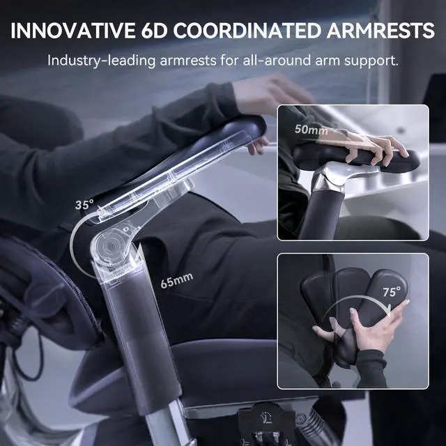 6D Armrests instant posture adaptability for gaming, office, or desk use.