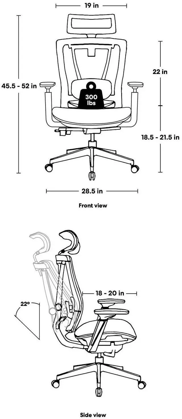 | Back dimensions (w/o headrest) | 21W x 22H (inches) |