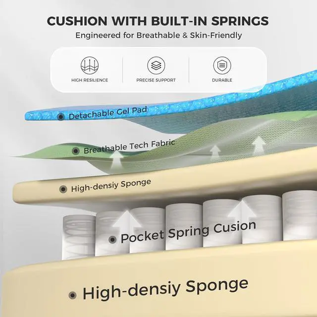Individually Pocket Springs: The seat cushion features pocket springs, a technique commonly used in sofas. Each spring operates independently, conforming to pressure and body weight to deliver resilient support and a luxurious comfort experience comparable to high-end gaming chairs.