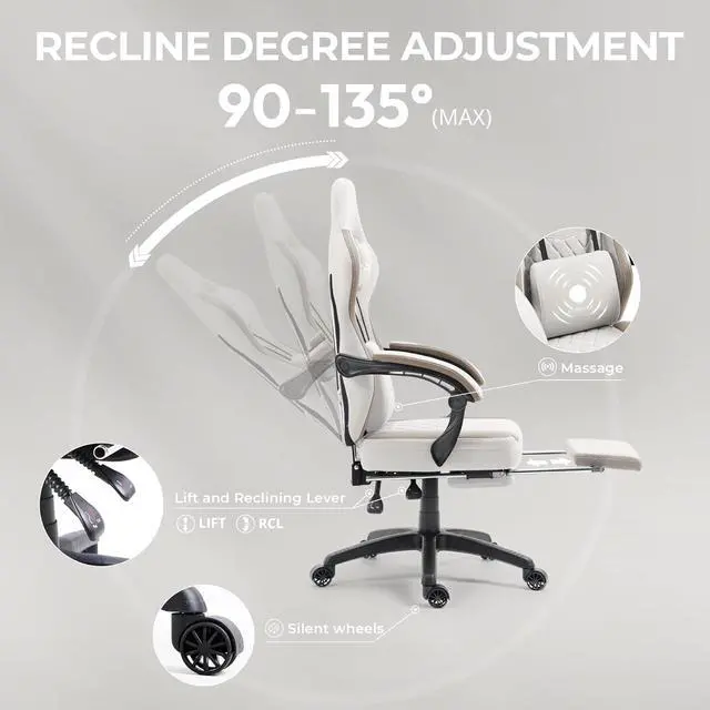Adapts to Daily Needs: From intense gaming marathons to afternoon naps, this versatile gaming chair delivers unwavering support. The 135-degree reclining backrest pairs with a retractable footrest to adapt to your posture, while height-adjustable massage lumbar and head pillows alleviate pressure on your neck and spinemaking it ideal for competitive gamers and office professionals alike.