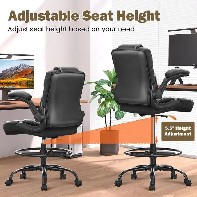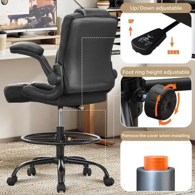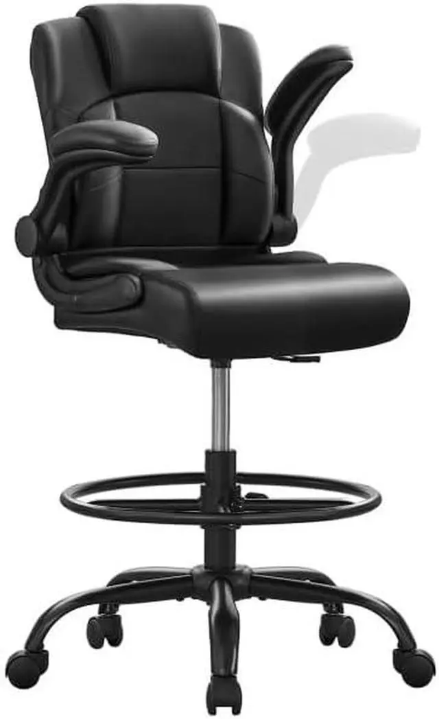 , :Meet your new favorite standing desk chair, built for those who work at elevated heights. This heavy duty office chair certified powerhouse keeps you steady whether you're sketching blueprints,mixing drinks,or conquering spreadsheets.The reinforced steel frame and foot ring ensure all-day comfort,while flip-up armrests mean no awkward bumps when you slide up to your high office chair workstation.Perfect as a tall desk chair for demanding work environments