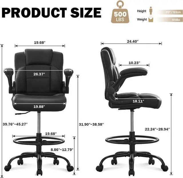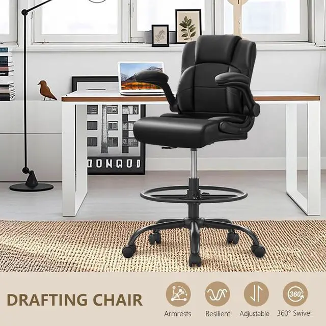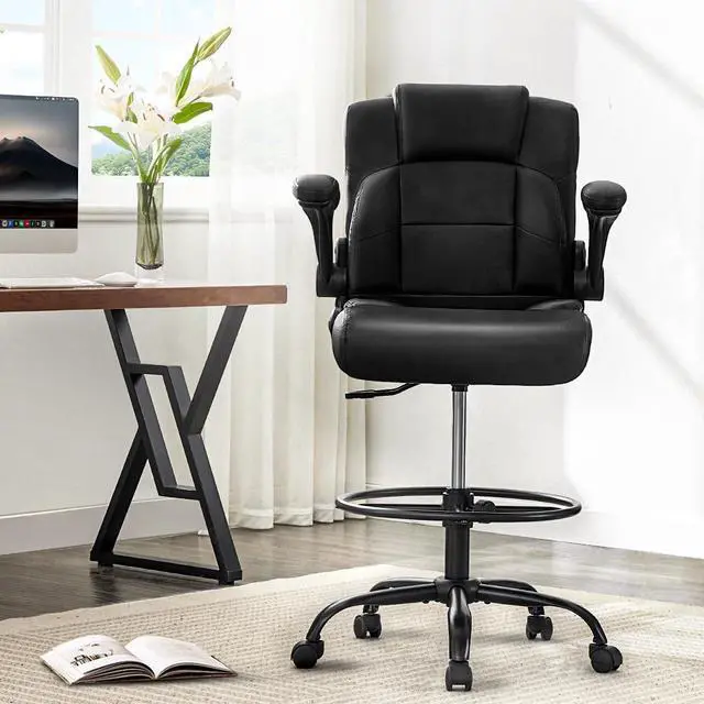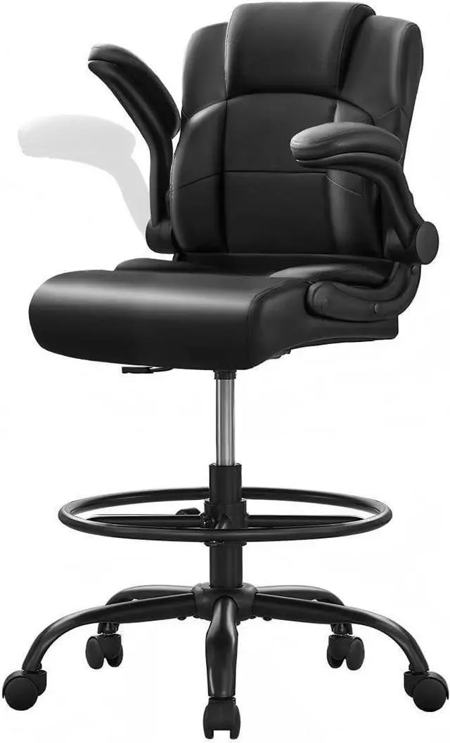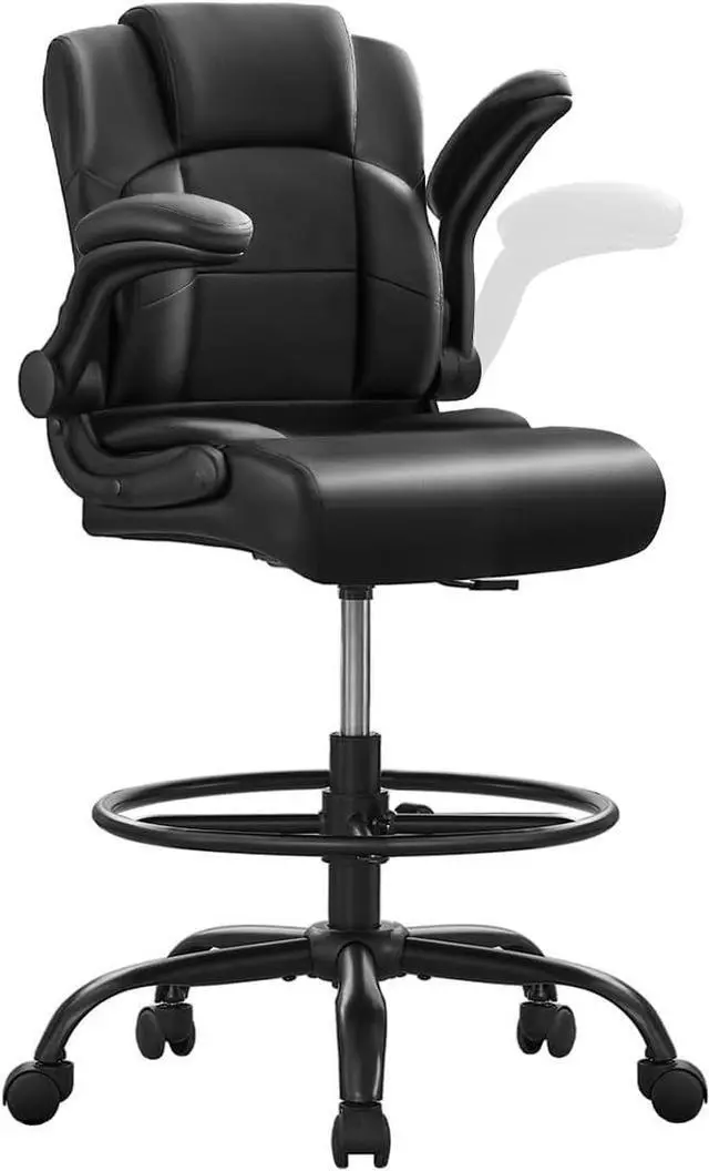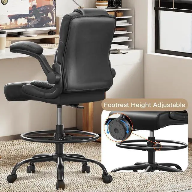500 lbs Drafting Chair Tall Office Chair with Flip-up Armrests for Standing Desk Executive Ergonomic Computer Leather Desk Chair with Lumbar Support, Adjustable Foot Ring for Home or Drawing Use