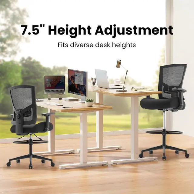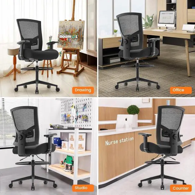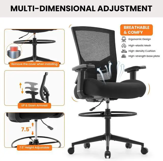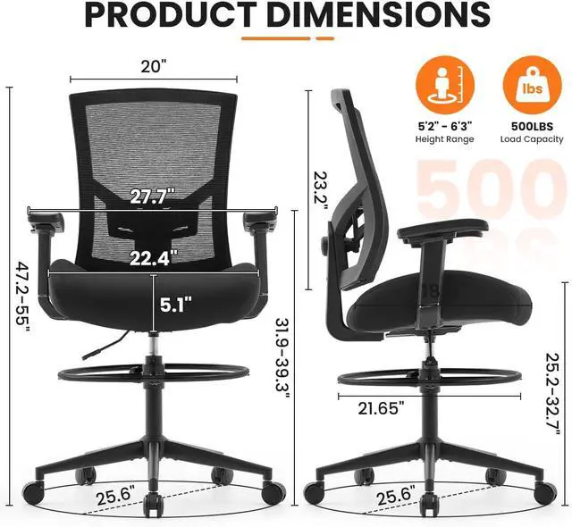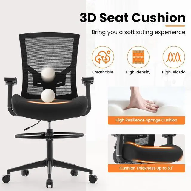 :Experience all-day comfort with our drafting chair's wide seat.Measuring 22.4" wide and 5.1" thick,it allows natural movement,reduces hip pressure,and prevents fatigue.The larger surface distributes weight evenly for superior stability and healthy posture.Perfect for long creative or technical tasks,this enhanced support boosts focus and productivity.This tall desk chair is the ideal seat for elevated workstations.