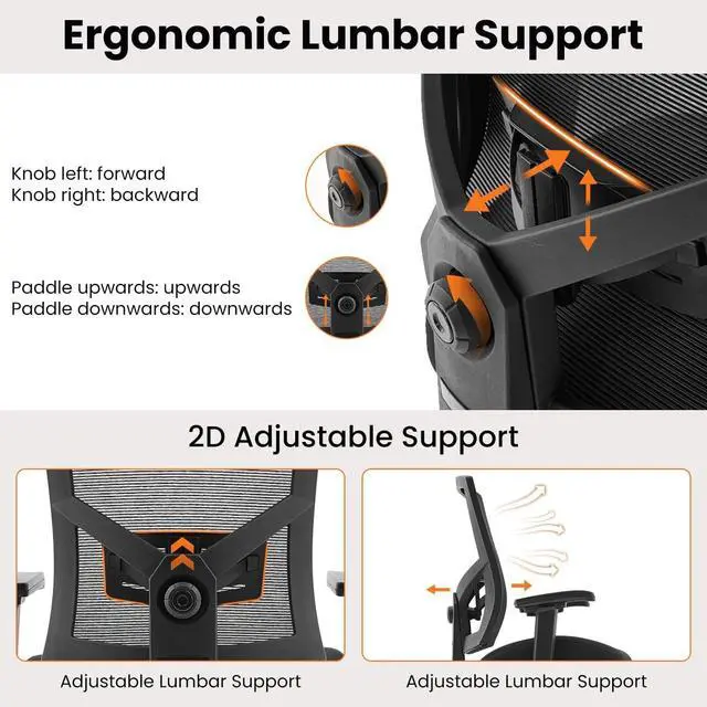 :This standing desk chair features an S-curve backrest that matches your spine's natural shape for balanced support.Its 2D adjustable lumbar system offers personalized comfort for all heights.It helps reduce lower back pressure,improves long-term seating comfort,and encourages proper posture throughout your workday.