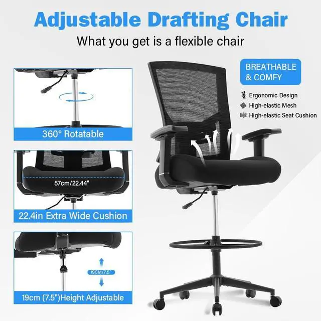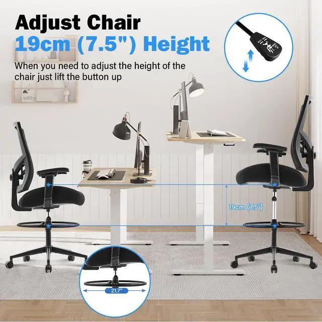 : This ergonomic drafting chair features an adjustable lumbar support that consistently provides ample support for your lower back, helping to relieve fatigue from long hours of sitting. Additionally, the 22.4" extra-wide seat, footrest and armrests are all manually adjustable, allowing you to customize your seating for maximum comfort.