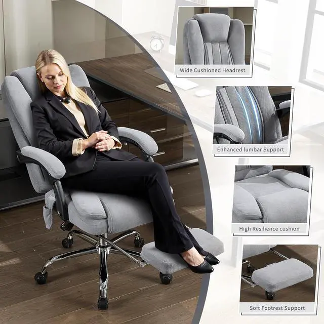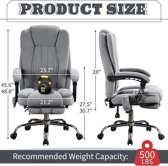 - & Engineered to support up to 500lbs, this Big and Tall Massage Office Chair f The reinforced steel frame and heavyduty fivestar base deliver unwavering stability, while highdensity foam padding and breathable fabric keep you cool and comfortable through marathon work sessions. Smooth pneumatic height adjustment and fully adjustable armrests let you customize your posture for peak productivity.
