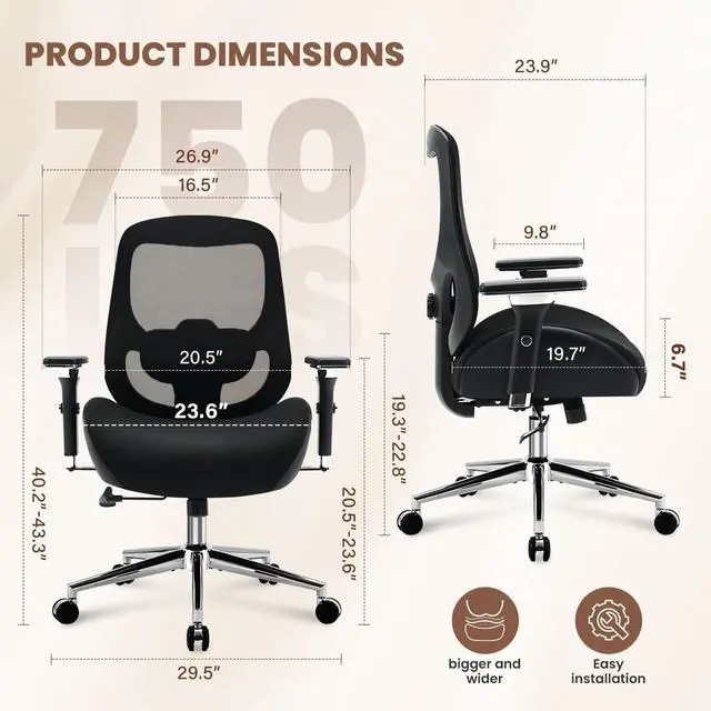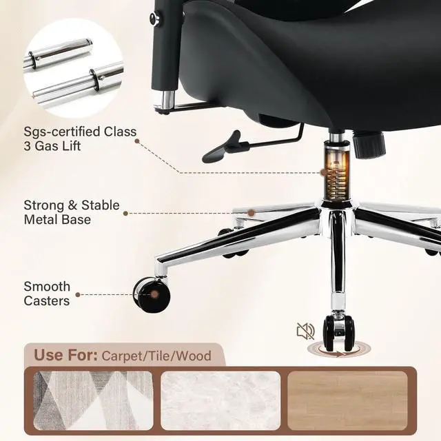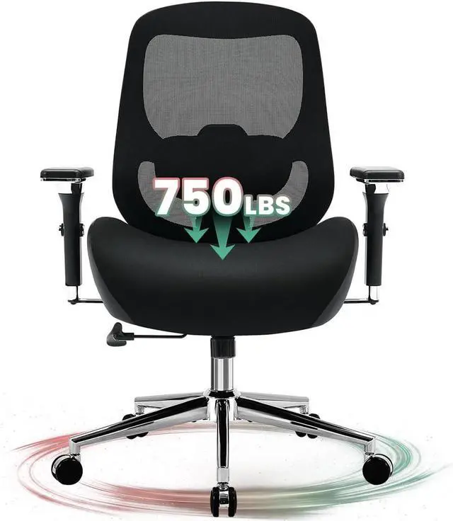 :Struggling to find a chair that supports you? KWKSV's heavy-duty Big and Tall Office Chair supports up to 750 lbs with ease. The high-quality frame and base provide reliable durability. Whether youre working long hours or need a dependable desk chair, this one delivers. Its smooth-rolling wheels have passed the BIFMA 100,000-cycle test, effortlessly gliding over carpet or hardwood. Sturdy design for lasting comfort and support.