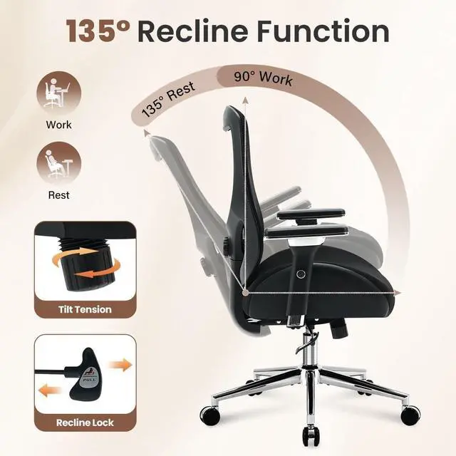 :This computer desk chair makes working way easier with soft, flexible 4D adjustable arms that perfectly support your arms and shoulders. You can also adjust the height and use the tilt knob under the seat to control how far the backrest leans.Whether sitting upright or leaning back (90°120°), it helps you maintain a comfortable angle throughout the day.Adjustable headrest to support your neck and reduce stress.