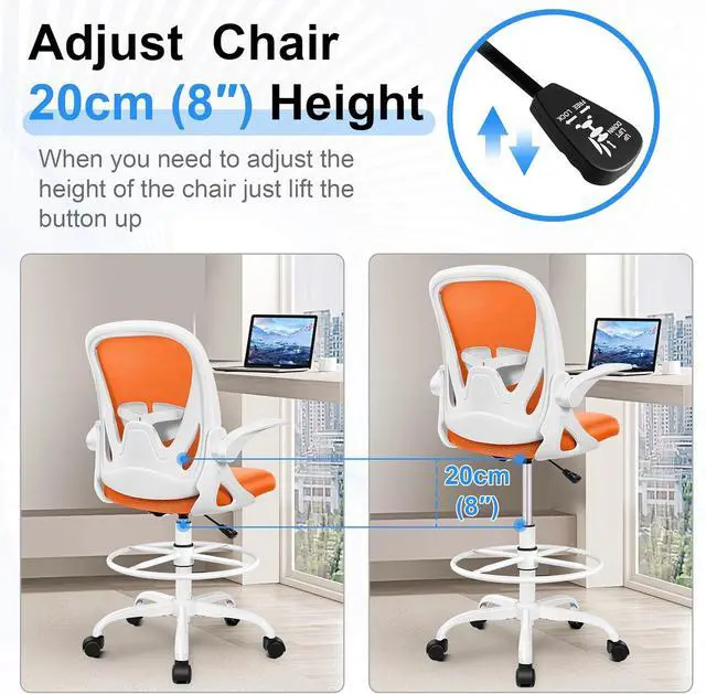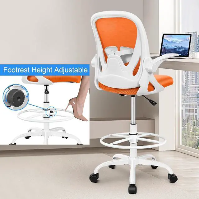 Primy Drafting Chair Tall Office Chair with Flip-up Armrests Executive Ergonomic Computer Standing Desk Chair with Lumbar Support and Adjustable Footrest Ring (Sunset Orange)