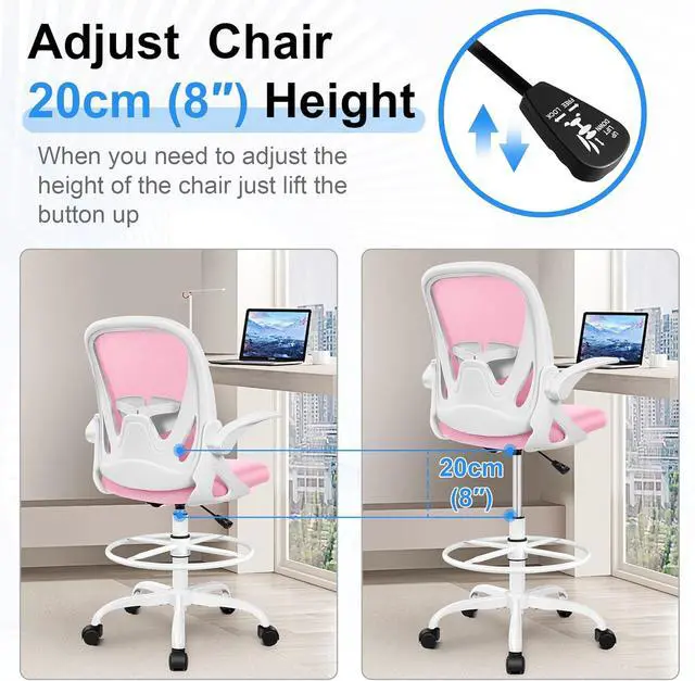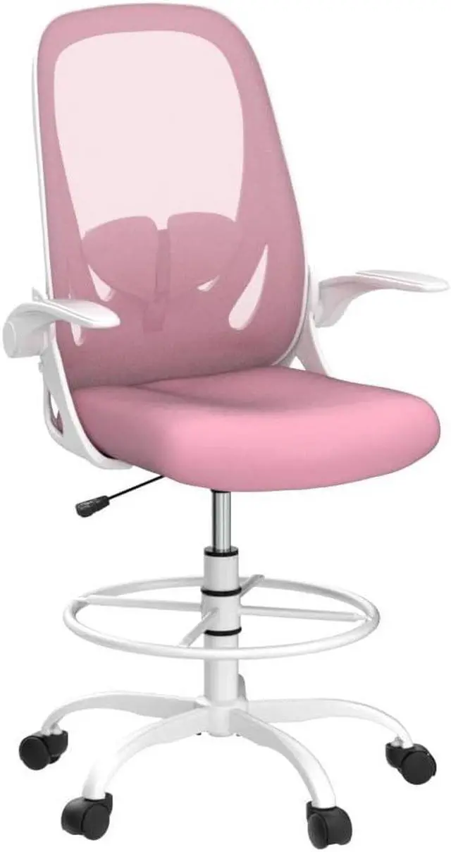 Primy Drafting Chair Tall Office Chair with Flip-up Armrests Executive Ergonomic Computer Standing Desk Chair with Lumbar Support and Adjustable Footrest Ring (Pink)