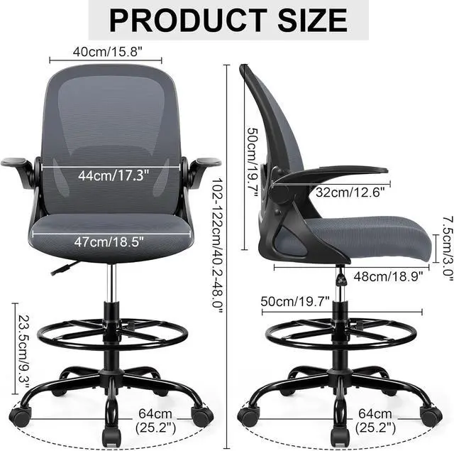 Adjustable Drafting Chair:This high rotary drawing chair has a foot stool with adjustable height, and the 90 degree overturned armrest design can save a certain amount of space, which is very suitable for standing desks, sitting desks and bars; Equipped with a round foot ring can help you move your feet more frequently, reduce the pressure on the back of your legs and improve comfort.
