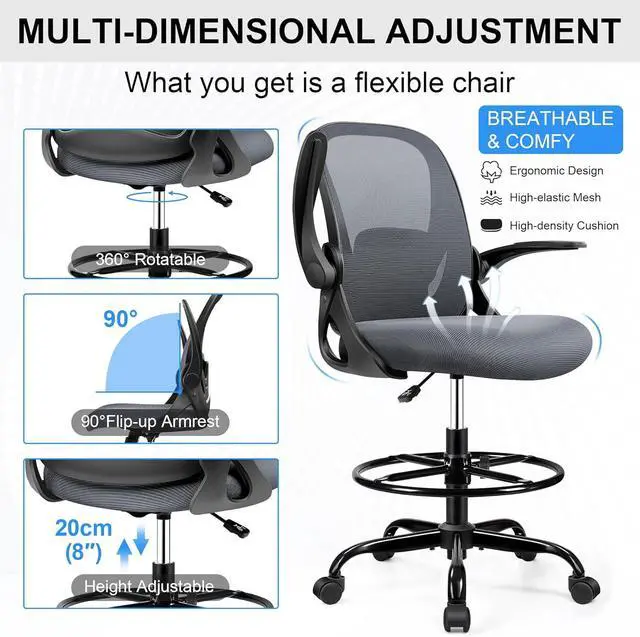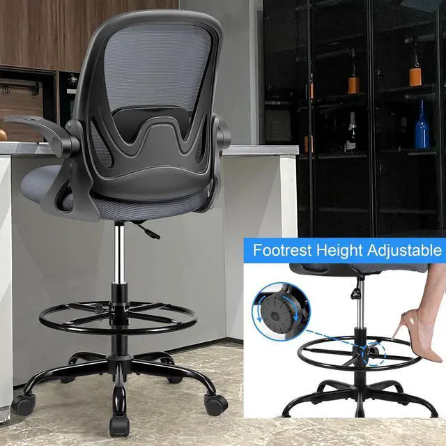 Drafting Chair Tall Office Chair with Flip-up Armrests, Adjustable Height, Enhanced Lumbar Support Ergonomic Rolling Stool, Back Support, Adjustable Foot Rest Ring for Standing Desk Dark Gray