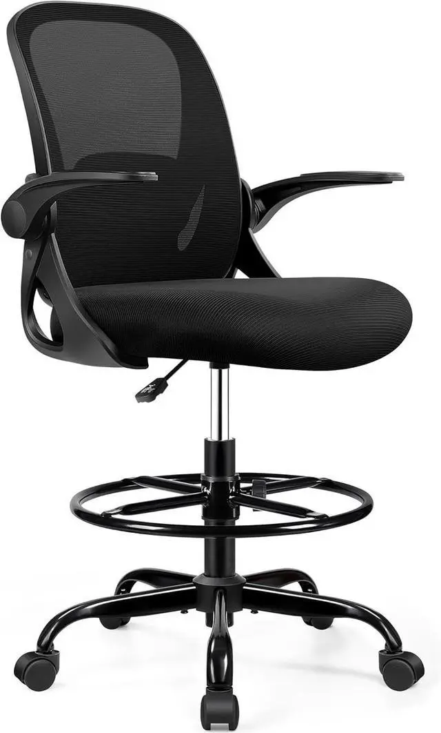 Drafting Chair Tall Office Chair with Flip-up Armrests, Adjustable Height, and Enhanced Lumbar Support - Ergonomic Rolling Stool, Back Support, and Adjustable Foot Rest Ring for Standing Desk Black