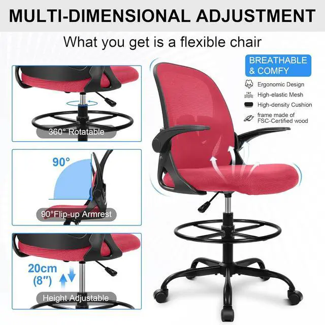 Adjustable Drafting Chair:This high rotary drawing chair has a foot stool with adjustable height, and the 90 degree overturned armrest design can save a certain amount of space, which is very suitable for standing desks, sitting desks and bars; Equipped with a round foot ring can help you move your feet more frequently, reduce the pressure on the back of your legs and improve comfort.