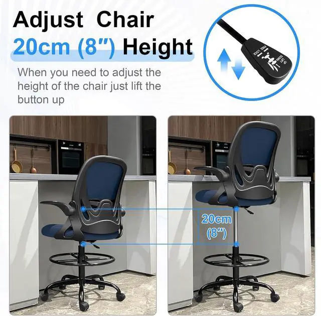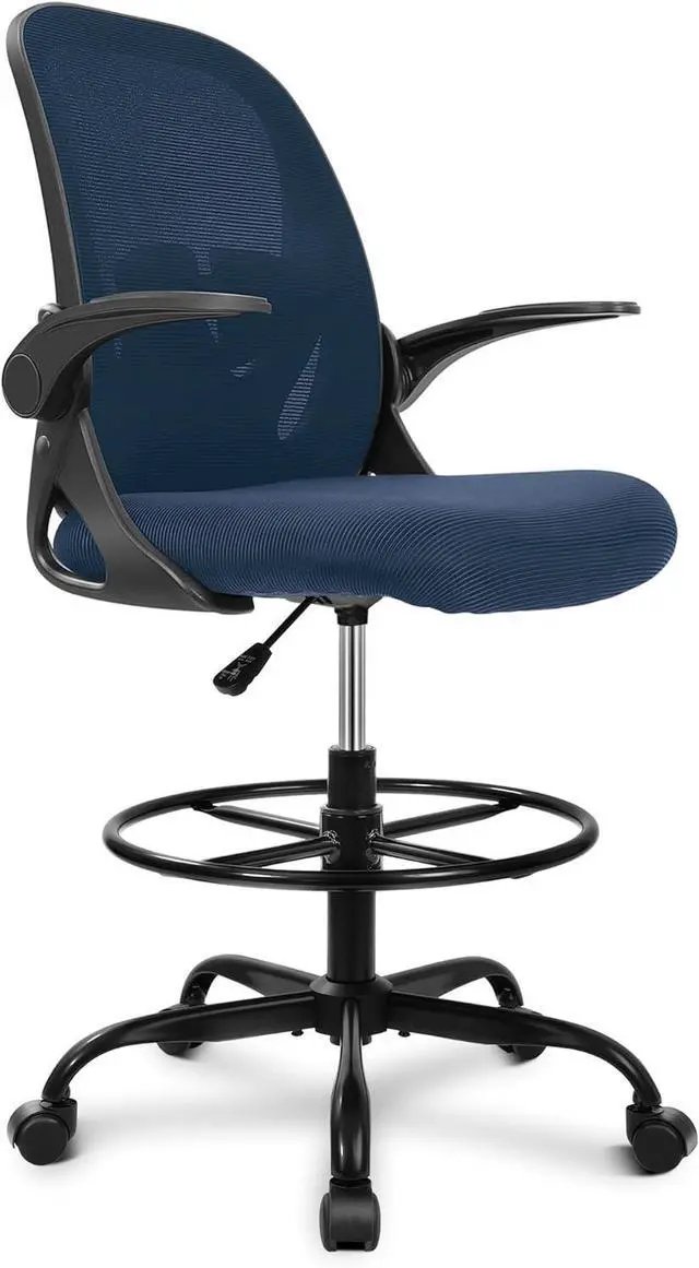 Primy Drafting Chair Tall Office Chair with Flip-up Armrests Executive Ergonomic Computer Standing Desk Chair with Lumbar Support and Adjustable Footrest Ring (Navy)
