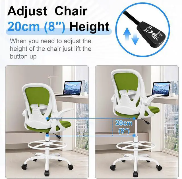 Primy Drafting Chair Tall Office Chair with Flip-up Armrests Executive Ergonomic Computer Standing Desk Chair with Lumbar Support and Adjustable Footrest Ring (AvocadoGreen)