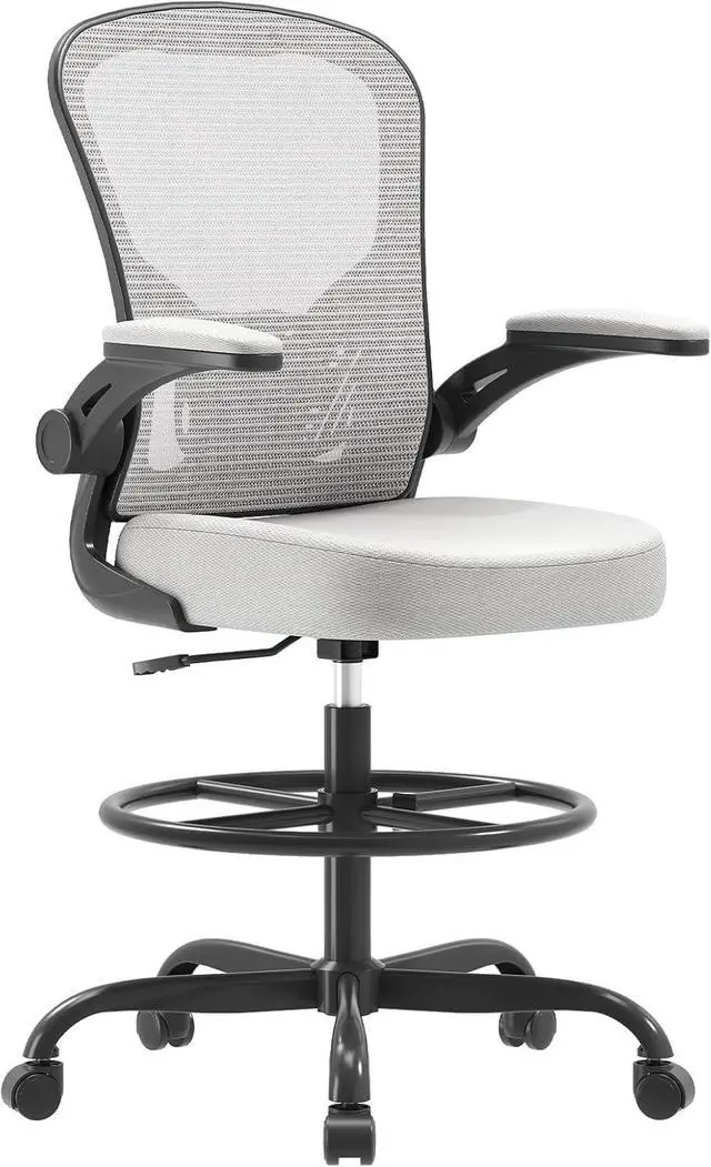 Ergonomic Drafting Chair, Tall Office Chair with Flip-up Armrests, Breathable Mesh High Desk Chair with Lumbar Support Adjustable Footrest Ring for Standing Desk Gray