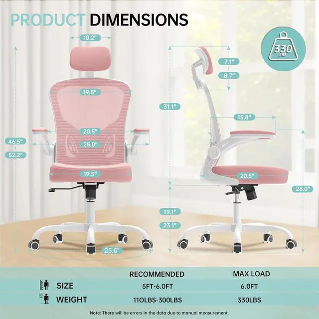 Comfortable Breathable Mesh Chairs: This office desk chair with 20.5"*20.5" breathable mesh backrest, 3.1" thick cushion offers a spacious seating area, accommodating various body types, accommodates heights from 5'0" to 6'0". Overall dimensions (including arms): 25.5 W x 23.2 D x 48.2-53.2 H. Its unique recline function allows you to tilt the backrest (90~135°), bring your comfort and relaxation.
