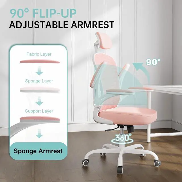 Office Chair Ergonomic Desk Chair, 330LBS Capacity, High Back Computer Chair for Long Hours Comfortable, Rolling Swivel Executive Task Chair for Home Office with Flip-up Armrests(White Pink)