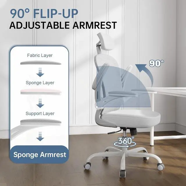 Office Chair Ergonomic Desk Chair, 330LBS Capacity, High Back Computer Chair for Long Hours Comfortable, Rolling Swivel Executive Task Chair for Home Office with Flip-up Armrests(Grey)