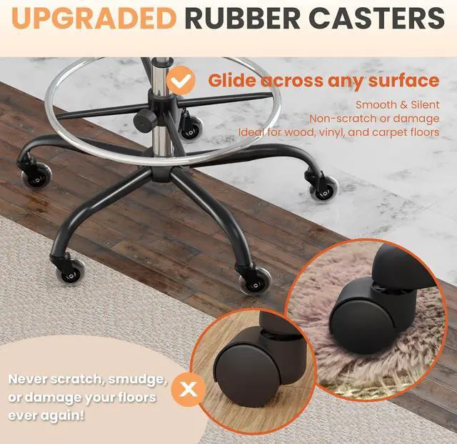 COMFORTABLE TALL OFFICE CHAIR: This high drafting chair has soft and thick seat to add comfort for your seating; smoothly adjustable height & footrest to adapt your different using senses; and upgraded rubber wheels to avoid noise and scratching of your floor. We made upgrade designs and insist on high quality materials to offer users better experiences.