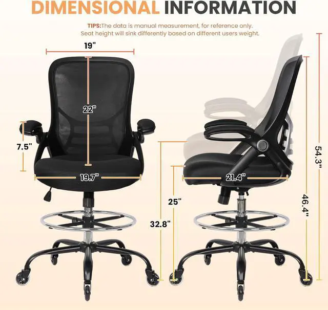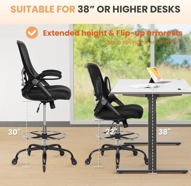 ERGONOMIC DRAFTING CHAIR: Ergonomically designed backrest and prominent lumbar support fit the natural curve of the spine, and keeps you in a good seating posture. Flip-up armrests could be folded up while not in use, makes it space-saving for limited rooms. Adjustable seat height and foot-ring makes this tall desk chair ideal for higher office desks, bar-height tables, drawing rooms, and standing desks.