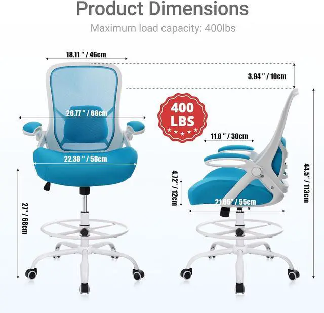 HYLONE 400lbs Heavy Duty Drafting Chair 5" Thickened Seat Office Chair with Flip-Up Armrests Tall Ergonomic Computer Chair with Lumbar Support and Adjustable Footrest Ring Standing Desk Chair (Blue)