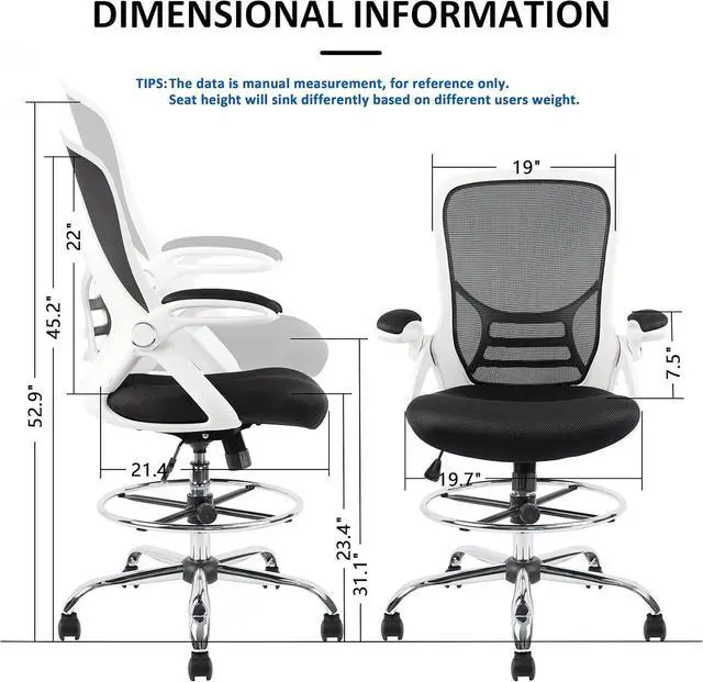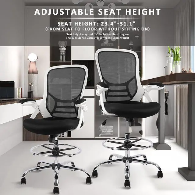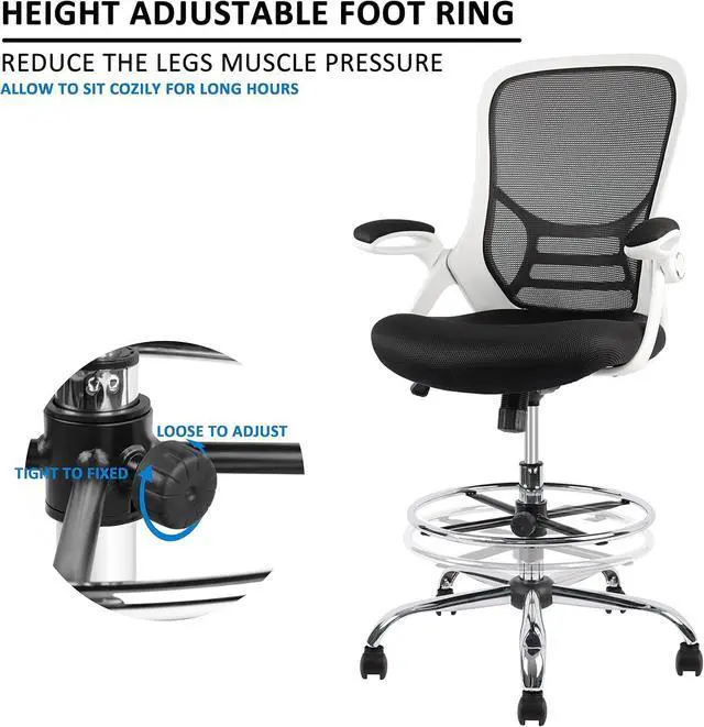 • Flip-up ArmsContoured padded arm pads are easy to get cozy, take pressure off your shoulders and neck; Flip up arms design makes your body closer to the desk, ensuring a good sitting posture. Let this ergonomic, high-back drafting chair bring your workday to new heights