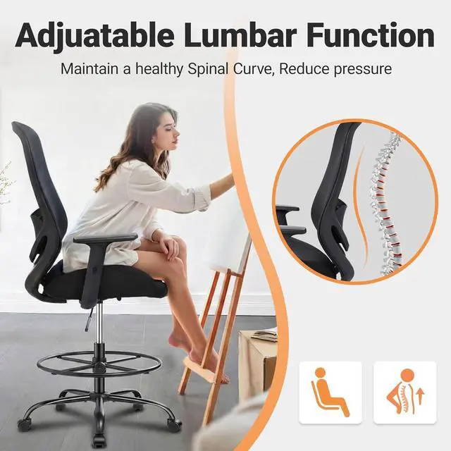 High Back Ergonomic Support for Long Hours-Featuring a full high back design, this ergonomic drafting chair provides extended support from upper back to lumbar area, helping maintain proper posture and reduce back fatigue during long hours of drawing, drafting, or office work.