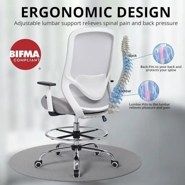 High Back Ergonomic Support for Long Hours-Featuring a full high back design, this ergonomic drafting chair provides extended support from upper back to lumbar area, helping maintain proper posture and reduce back fatigue during long hours of drawing, drafting, or office work.