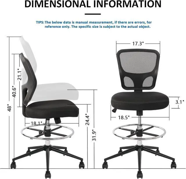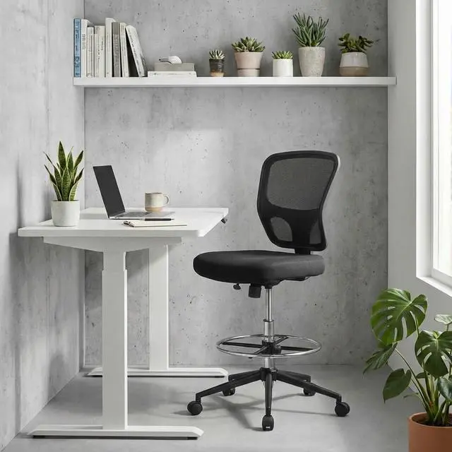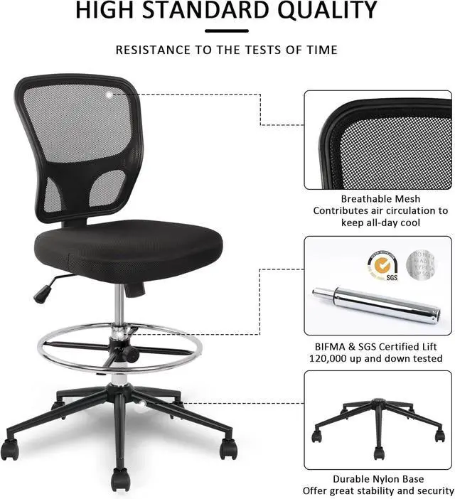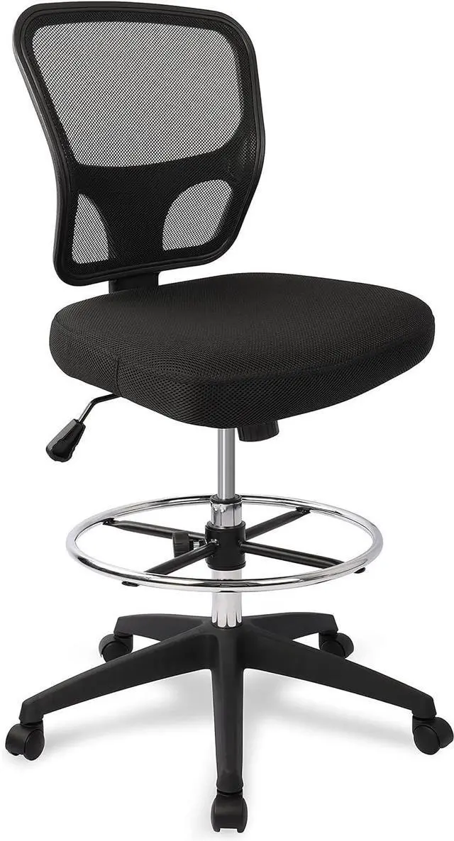 Space Saving Armless mesh drafting chair allows your body closer to the desk while in use, while not in use you can easily slip the high desk chair under the desk for space saving. Perfectly choice for work, home or other small space.