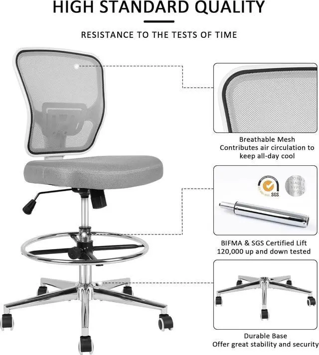 Space Saving Armless mesh drafting chair allows your body closer to the desk while in use, while not in use you can easily slip the high desk chair under the desk for space saving. Perfectly choice for work, home or other small space.