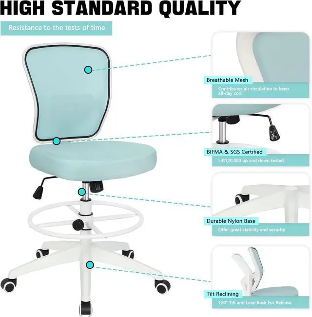 4. Premium MaterialsThe seat board made of FSC-Certified wood. Premium breathable mesh can promote air circulation to keep all-day cool and help you work more efficiently. The natural sponge cushion provides extra comfort during long time working. Drafting stool with durable nylon wheels offers great stability and mobility.