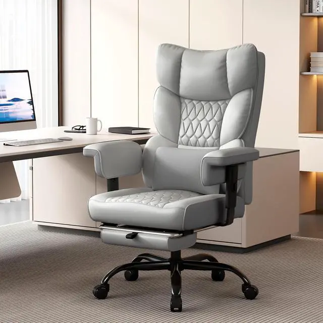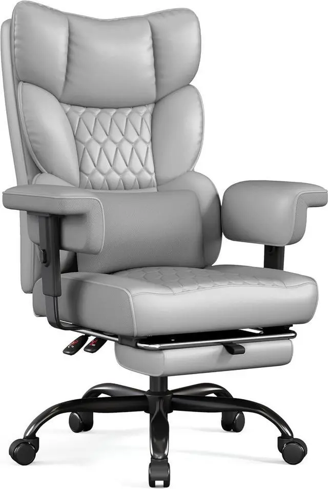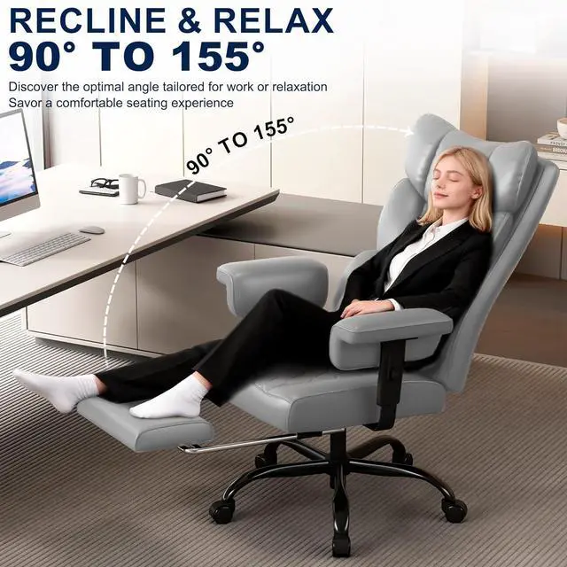 Misolant Big and Tall Office Chair with Footrest, High Back Executive Desk Chair with Adjustable Lift Armrest, 155°Recline,Lumbar Support Pillow, Faux Leather Gaming Chairs for Home or Office Gray