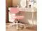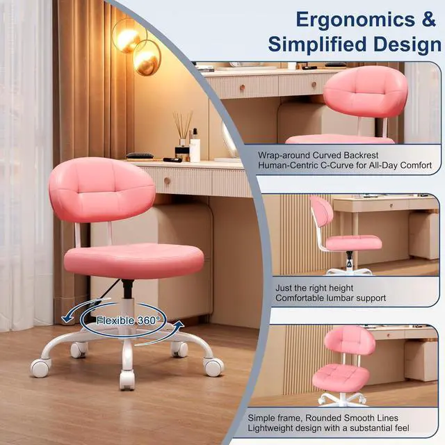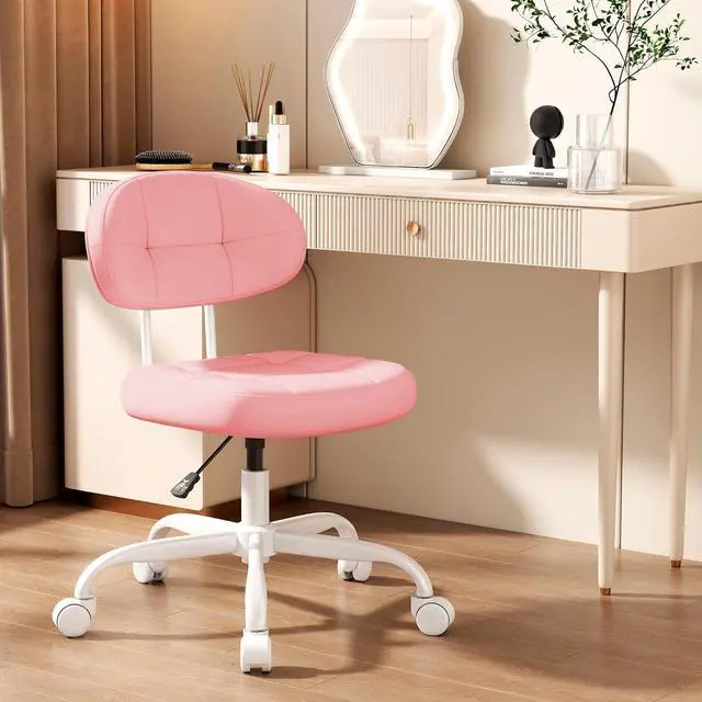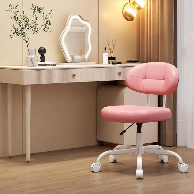 Misolant Vanity Chair with Back, Small Armless Cute Office Chair with Wheels and Lumbar Support, Comfy PU Leather Desk Computer Chairs with Adjustable Height, 360°Swivel for Home Bedroom Office, Pink