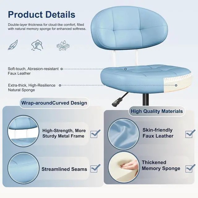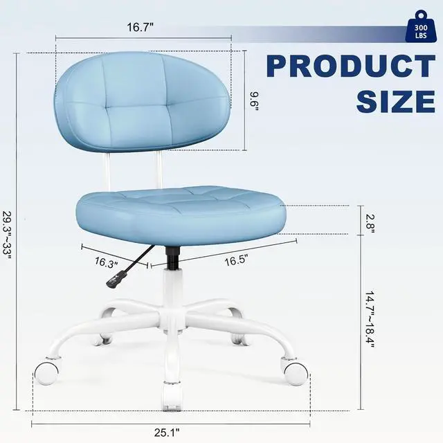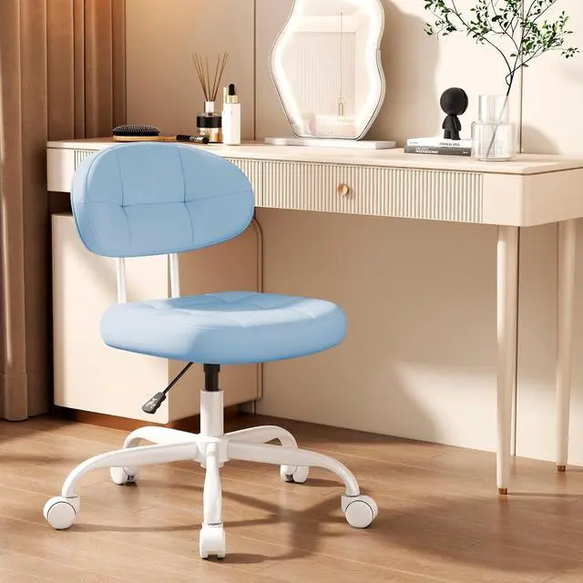 Misolant Vanity Chair with Back, Small Armless Cute Office Chair with Wheels and Lumbar Support, Comfy PU Leather Desk Computer Chairs with Adjustable Height, 360°Swivel for Home Bedroom Office, Blue