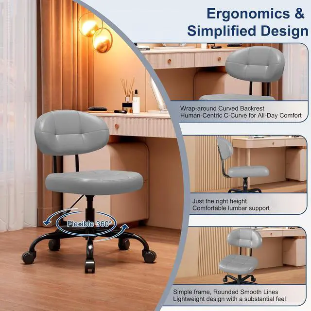Misolant Vanity Chair with Back, Small Armless Cute Office Chair with Wheels and Lumbar Support, Comfy PU Leather Desk Computer Chairs with Adjustable Height, 360°Swivel for Home Bedroom Office, Gray