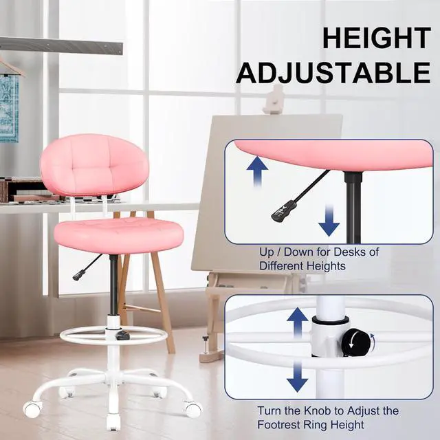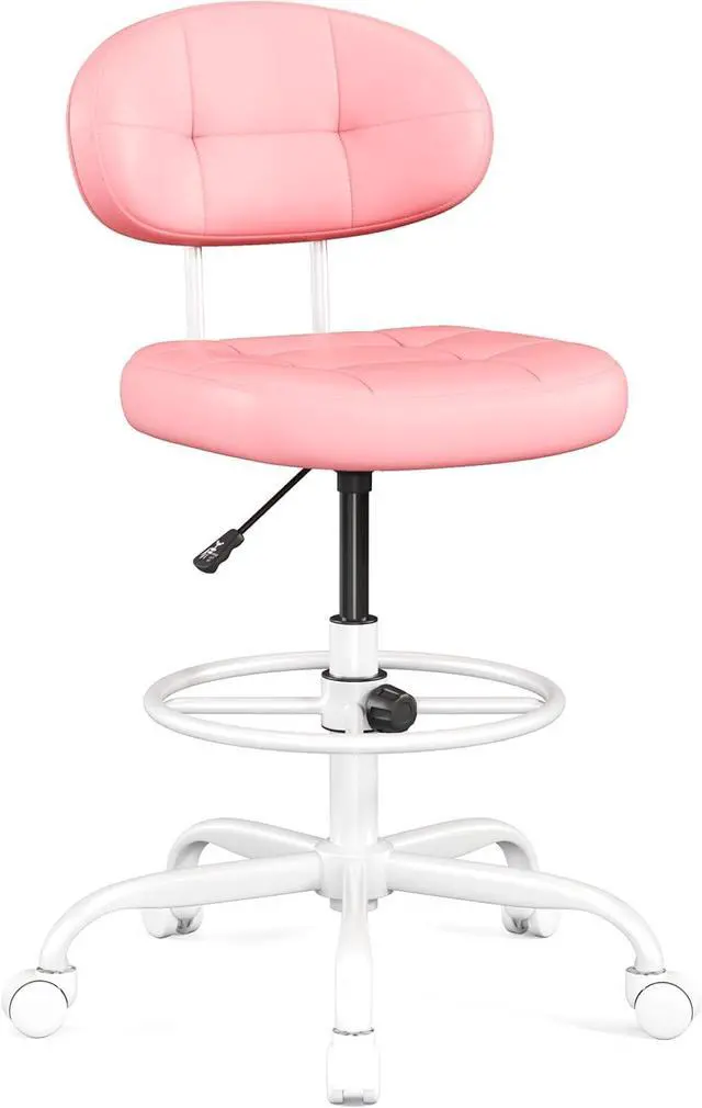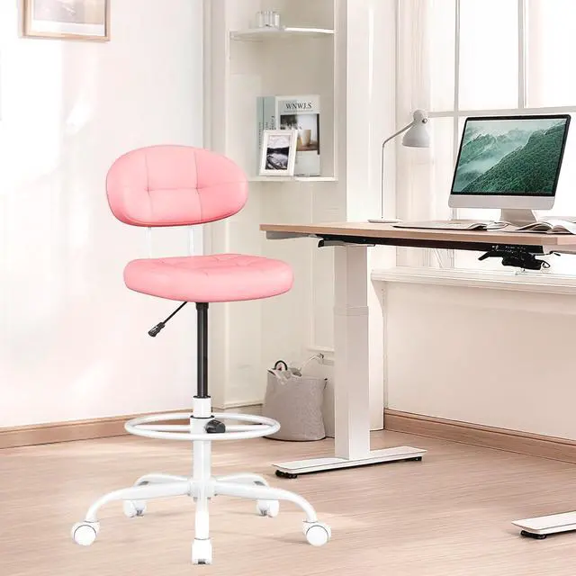Misolant Drafting Chair, Armless Tall Office Chair with Footrest Ring for Standing Desk, Small Faux Leather Executive Computer Chair with Adjustable Height for Bar Lab Counter Height Desk, Pink