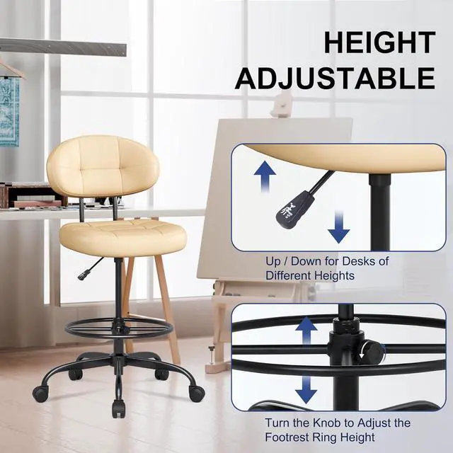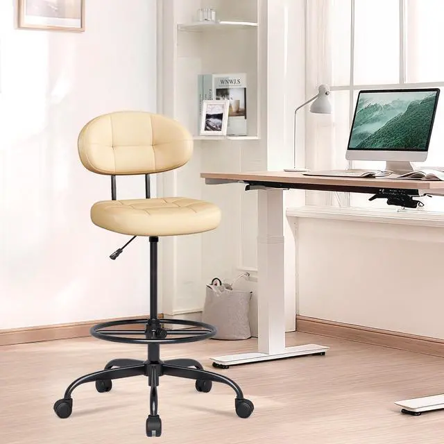 Misolant Drafting Chair Without Arms, Tall Office Chair with Footrest Ring for Standing Desk, Small Faux Leather Executive Office Chair with Adjustable Height for Bar Lab Counter Height Desk, Khaki