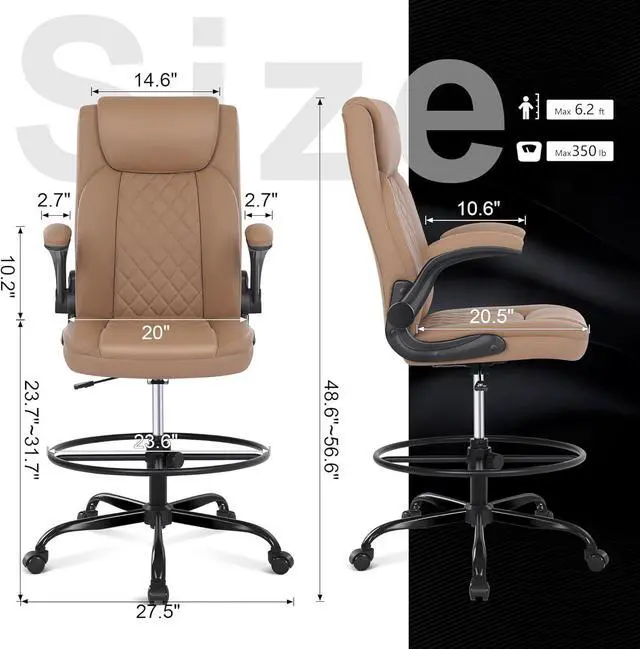 Ingenious Design: The ergonomic drafting chair is designed according to the curve of the human body, fitting the structure of the human body. The huge headrest provides wide-ranging neck support, and the diamond grid design adds elegance and temperament. The high desk chair is made with exquisite sewing technology, giving it a high-end and unique appearance. The double cushion design ensures a soft and comfortable sitting experience.