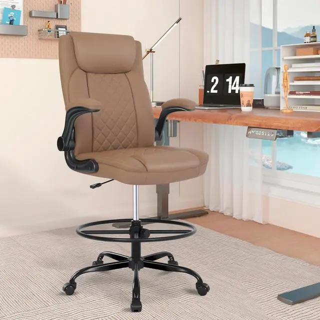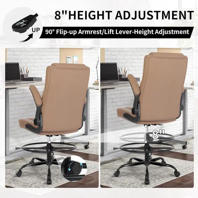 Misolant Drafting Chair, Tall Office Chair for Standing Desk, Standing Chair with Adjustable Height and Flip-up Armrest, Leather Drafting Chair, High Office Chair for Counter Height Desk Brown