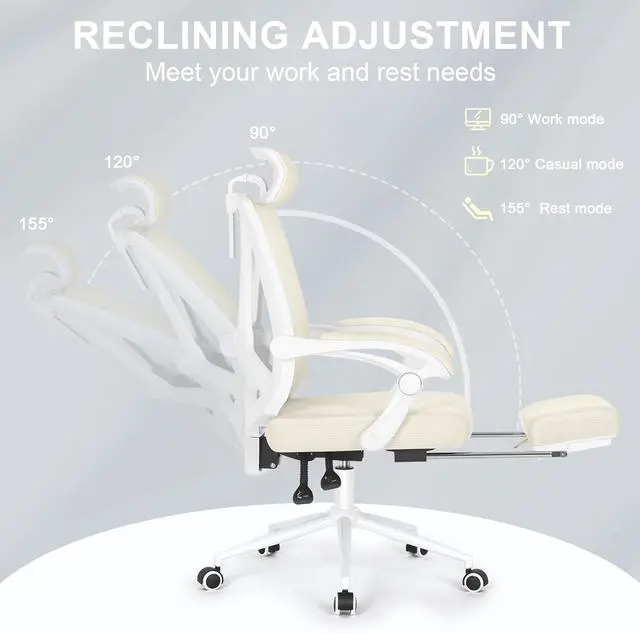 Lock in Any AngleThe chair back is ingeniously designed to recline and lock at any angle within 155°, offering you the flexibility to adjust your relaxation mode during lunch breaks or while working. With its soft and comfortable footrest, the chair provides a cozy experience, allowing you to unwind and change your posture as needed. Moreover, the dual-function headrest can be adjusted both vertically and flipped, providing comprehensive and customizable support for your head.