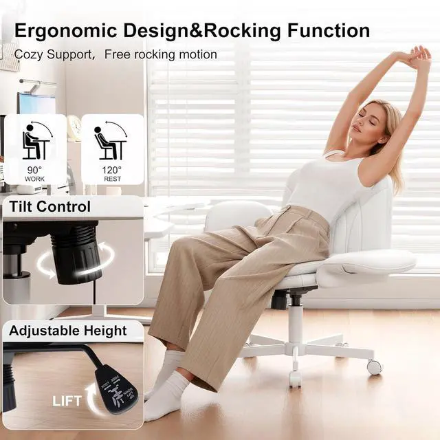 Gentle Rocking Function & 360° Swivel: The desk chair seat cushion features a double-layer thickened design, offering soft and comfortable support that wont collapse even after prolonged sitting. Equipped with a steel tray base with a rocking function, it can rock backward like a rocking chair, perfect for reading and relaxing. The 360-degree swivel wheels allow smooth movement across floors without causing damage.